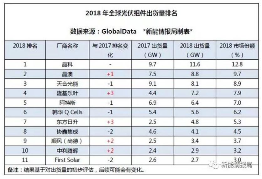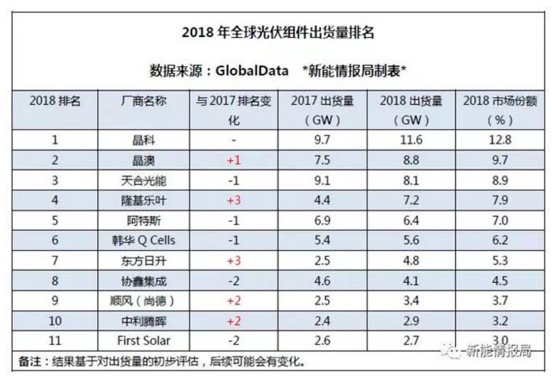 根据GlobalData发布的数据,2018年晶科以11.6GW的出货量和12.8%的市场份额继续保持全球组件出货第一的位置。晶科能源已连续四年保持全球组件出货第一的位置。全球组件出货量排名前10的公司中,9家来自中国。