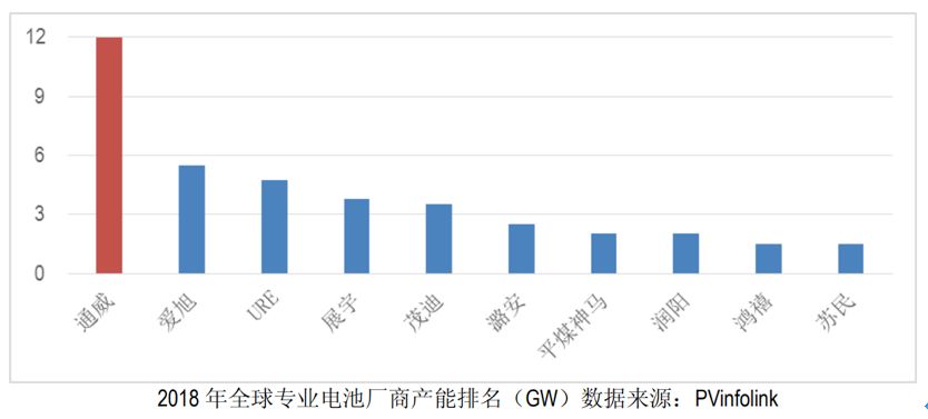将硅片加工为电池片,是实现光电装换最为核心的步骤。根据权威光伏分析机构 PVInfolink 公布的全球太阳能电池企业产能排名,截至报告期末,通威 太阳能以 12GW 产能位列全球太阳能电池制造企业第一位。2019 年 3 月公司启动了成都四期及眉山新建项目,预计 2019 年底公司太阳能电池规模将达到 20GW,进一步提升行业集中度,巩固公司在太阳能电池环节的规模优势。