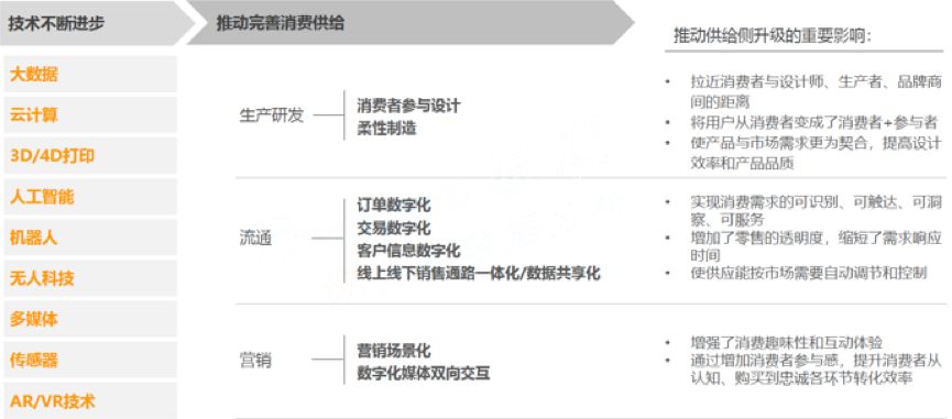 大数据、人工智能、物联网等各类技术的涌现给消费行业带来了全新的冲击与机遇,产业链的各个环节都将渗入科技元素。对于供给端而言,技术赋能供给,信息传递能力的提升,使得消费者与制造商的信息反馈通道更为通畅,产品定制化成为可能;数据分析能力的提升,使得销售商能更为精准的营销,并触达消费者的核心需求。