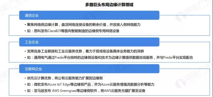 边缘计算解决了物联网应用场景对更高安全性、更低功耗、更短时延、更高可靠性、更低带宽的要求,还可以大限度的利用数据,进一步的缩减数据处理的成本,在边缘计算的支持下,大量物联网场景的实时性和安全性得到保障。信通院数据显示,未来将有超过75%的数据需要在网络边缘侧分析、处理与储存,故边缘计算成为新一轮布局重点,多路巨头立足优势纷纷进入,包括通信企业、工业企业和互联网企业等。