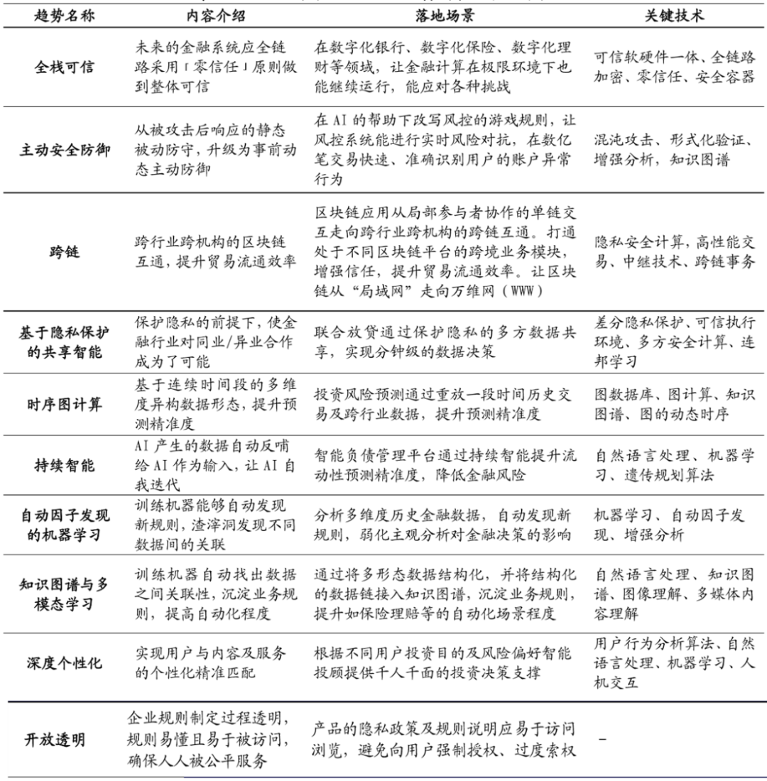 本次“外滩大会”发布了2021年全球十大 Fin-tech趋势,包括全栈可信、主动安全防御、跨链、基于隐私保护的共享智能、时序图计算、持续智能、自动因子发现的机器学习、知识图谱与多模态学习、深度个性化、开放透明,其中六项属于信任构建与隐私保护,深化区块链、人工智能在金融领域的应用。