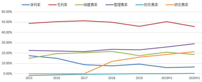 科大讯飞毛利率维持在50%左右,但整体呈下降趋势;费用端主要系管理费用、销售费用、研发费用,目前销售费用呈下降趋势,但管理费用及研发费用仍呈上升趋势,研发费用的快速上升对利润侵蚀严重,导致盈利能力下滑。