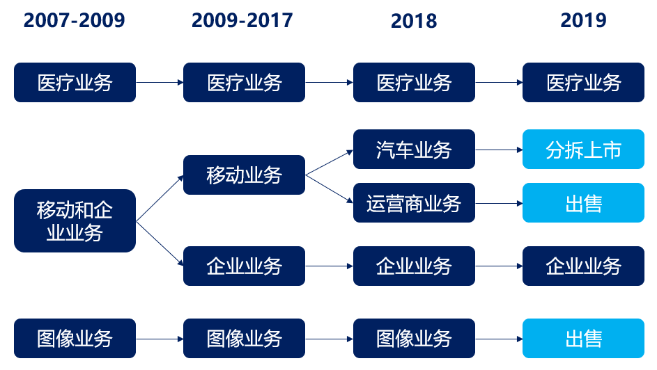 经过持续的低迷期后,Nuance逐步收缩其通用型场景业务:对图像、汽车、运营商业务进行剥离,至2019年Nuance业务已聚焦于场景化属性较强的医疗、企业服务两个板块,合计占营收及利润比重约80%。