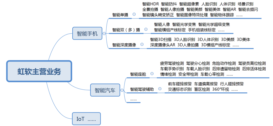 虹软专注于计算机视觉领域,为行业提供算法授权及系统解决方案,核心应用领域包括:手机、ADAS、IoT。