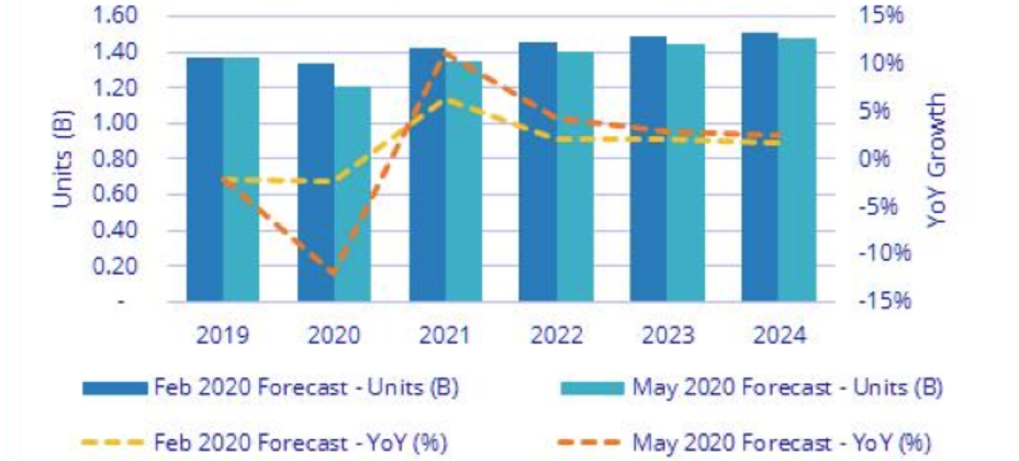 2020 IDC Worldwide Smartphone Forecast显示:1)2020年受疫情影响,全球智能手机销量同比下降11.9%;2)2021年受低基数影响,全球智能手机销量同比增长5%-10%;3)2022-2024年维持0-5%的同比弱增长。智能手机出货量整体维持弱增长趋势(增长主要来自于新兴市场国家)。