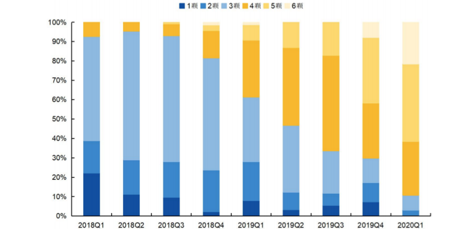 2)不同时期上市的手机摄像头数量增加趋势明显。目前“前置双摄+后置四摄”将成为安卓主流配置,此配置的新机占比有望提升至70%(目前有部分厂商已推出“前置三摄”及“后置五摄”的机型)。