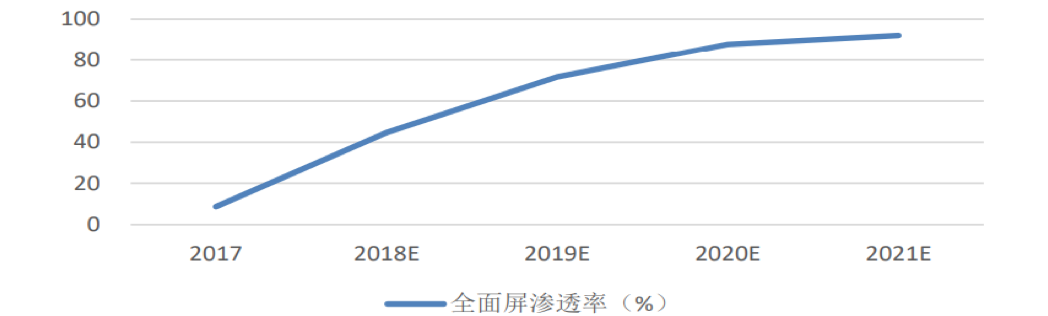 根据IHS数据,2018年屏下指纹识别技术的渗透率为2.1%,随着技术的市场验证,预估2021-2022年屏下指纹识别在智能手机中的渗透率有望达到3成,2023年接近4成,以全球全年销售手机14亿部智能手机计算,搭载屏下指纹识别方案的手机出货量将达5.6亿部。且可以预见在未来几年中,越来越多的安卓手机品牌会采用屏下指纹识别技术,屏下指纹识别技术也将因搭载率的升高,技术愈加完善带来的良率提升等而价格逐渐走低,向中低端安卓机型的渗透。