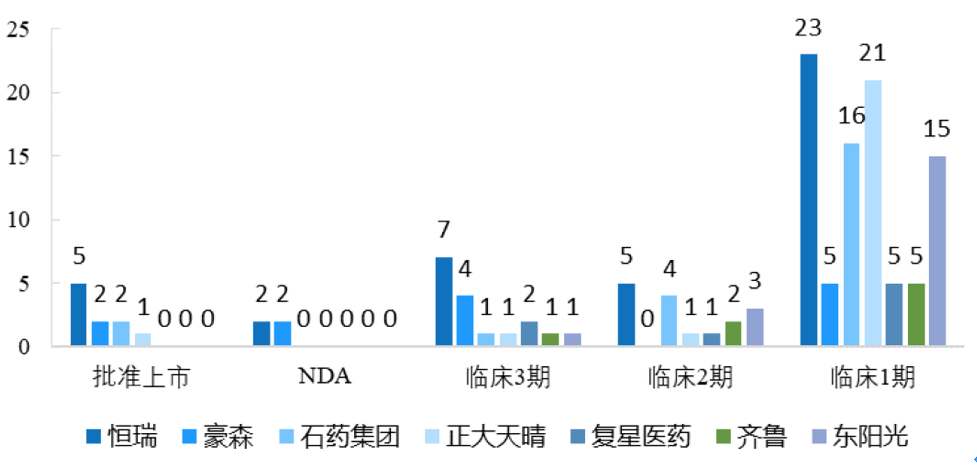 分研发进度看,恒瑞的产品在各个阶段的数量均呈领先地位,可以形成产品梯度带来的迭代效应,支撑未来产品上市。