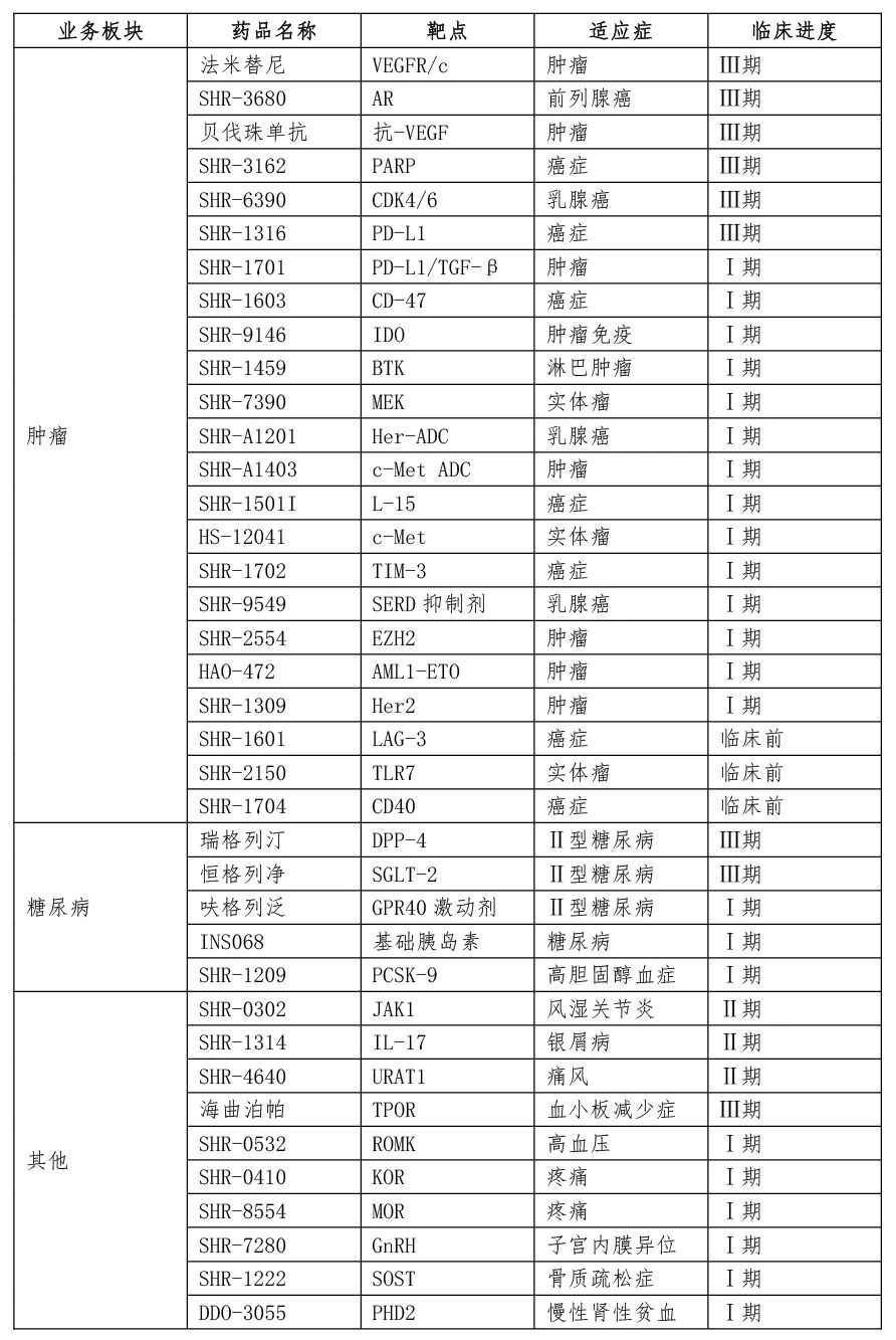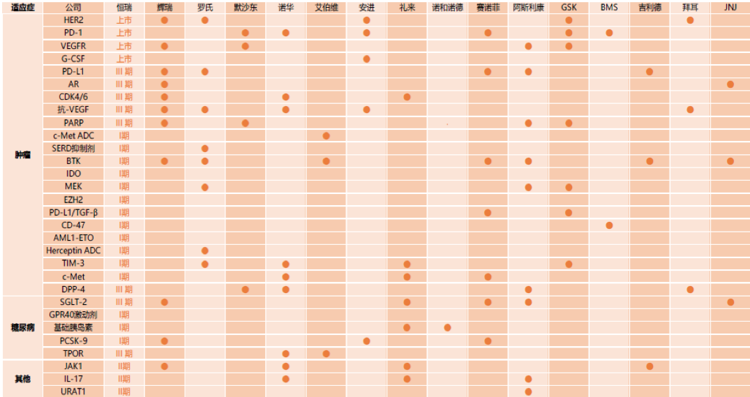 公司目前在研管线从数量及进度的角度看,均全面领先,同时从靶点的布局情况看,恒瑞在国内已找不到对标企业,目前已可对标国际一线药企。