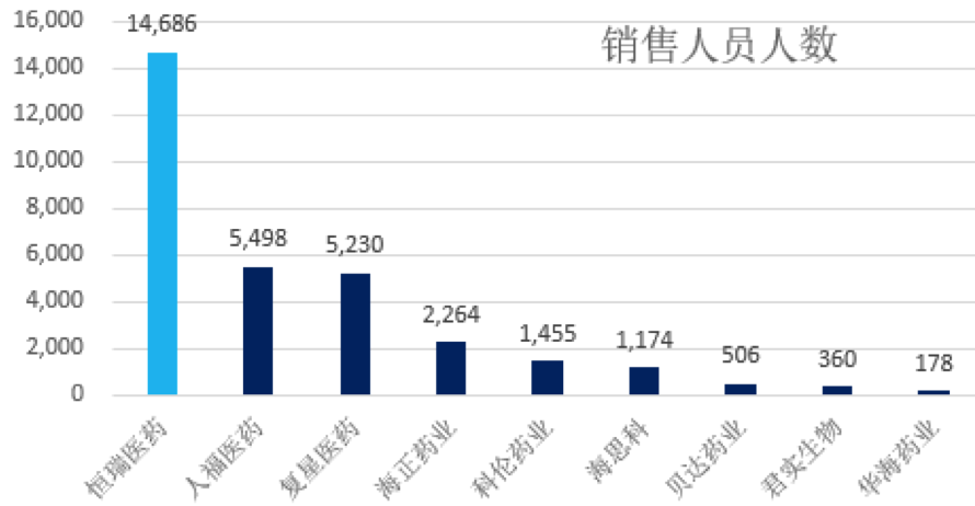 在4+7大背景下,销售代表纷纷从传统的销售模式向学术营销转型,拥有好品种的企业自然是优秀销售代表们的选择,恒瑞是国内1类创新药、重磅仿制药产品管线最多、最好的企业,对有优质销售人才的吸引能力较强(2015-2019年销售人员的增速分别为11.3%、32.7%、16.1%、43.9%、20.6%)。