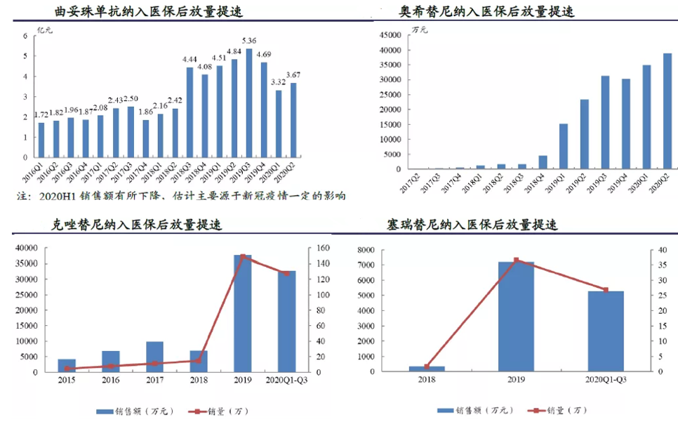恒瑞PD-1进入医保前的年用药费用在10万元(考虑赠药),本次医保谈判预计价格下降80%,叠加医保承担70%,患者自费的年用药费用在2万元内,2019年人均可支配收入已破3万元,市场可及率将有显著提升。目前全市场的PD-1渗透率预计为7%,短期内或有3-4倍的提升。参考历史上竞争格局优良的曲妥珠单抗、奥希替尼,以及竞争格局激烈的克唑替尼、塞瑞替尼,在进入医保后市场销售均快速放量。