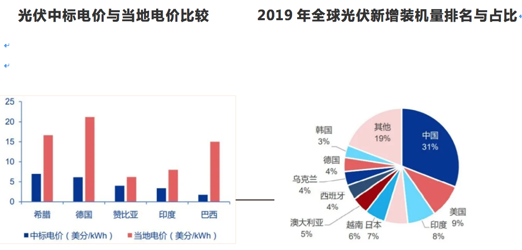 随着技术主导的光伏产业链综合成本持续下降,全球部分已经率先实现发电侧平价,全球光伏产业正在逐步向市场(即经济性)驱动过渡。在用电价格较高、光照条件较好、非技术性成本较低的部分海外市场中,光伏已成为最廉价的电力来源,希腊、德国、赞比亚、印度、巴西、西班牙、意大利等国家光伏发电成本已低于火电。