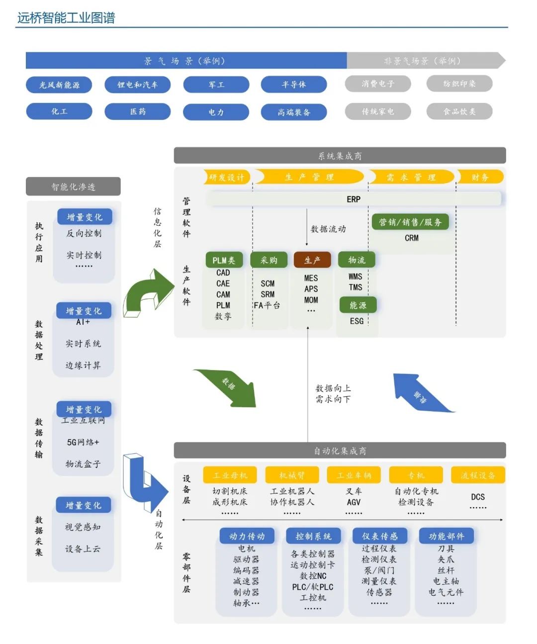 工业企业管理着研发-采购-生产-销售的流程,其中最为核心的主线是精益生产,而生产过程中管理的核心要素则是影响产品品质的5大要素“人机料法环”(人员,机器,物料,方法/工艺,环境)。人力密集型的传统制造产业升级,关注提升供应链的敏捷可控和工人高人效的实现;设备密集型的流程化工,半导体等行业,则更关注对设备进行稳定运行监控和智能运维来管控生产效率与生产品质;