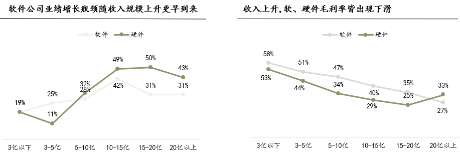 结合前文所述的收入规模对比,可以相对容易地的出软件公司的业绩增长瓶颈更早地到来;在毛利率方面,软件产品的毛利率持续高于硬件产品,但是伴随着收入规模的扩大,我们可以看到硬件企业毛利率因规模效应出现了上升,继而反超软件公司。这里给到我们的启示是:在中国可能真正的软件产品市场并没有想象的那么大,创业企业抓住1-2个软件产品市场,初期获取高毛利具备可行性,但思考做大规模则可能较快遇到成长瓶颈,集成类型业务的扩大和毛利率下滑是普遍规律。