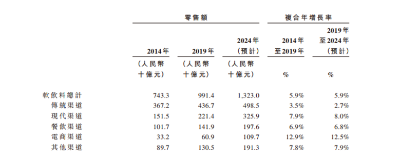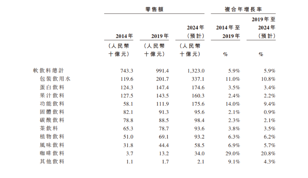 饮料按乙醇含量可以分为酒精饮料和非酒精饮料两大类,酒精饮料包含各种酒类如啤酒、白酒、黄酒、红酒等;非酒精饮料指乙醇含量(质量分数)不超过0.5%的饮品,通常也将其称为软饮。中国饮料行业的产业化发展起始于1978年底可口可乐重新进入中国市场,此后软饮料行业进入高速发展的四十年,品类不断拓宽,大单品也层出不穷。截止2019年底,中国已经成为全球最大的软饮料市场之一。根据弗若斯特沙利文报告,2019年中国软饮料市场规模为人民币9,914亿元,从2014年至2019年复合年增长率为5.9%。