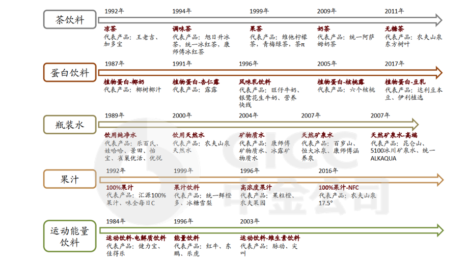 回顾软饮料发展历程,行业共经历了六次主要浪潮,主要产品分别对应碳酸饮料、瓶装饮用水、茶饮料、果汁饮料、功能型饮料、近水饮料六大品类,每次浪潮后软饮料行业的细分产品品类及规模均迅速提升。