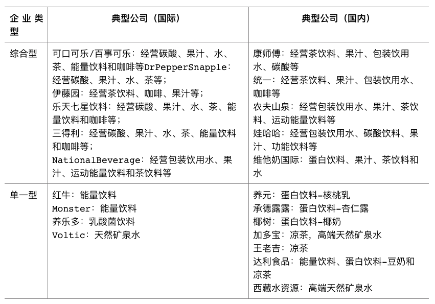 软饮料行业内企业按照经营基础品类可分为单一型饮料企业和综合性企业。综合型企业同时经营两个或两个以上基础品类的饮料,而单一型饮料企业专注于一个细分市场。