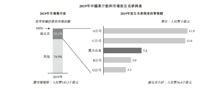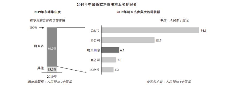 根据弗若斯特沙利文报告,中国软饮料市场集中度相对较低。按2019年零售额计算,前十名参与者合共仅占42.5%的市场份额,其中前四大参与者零售额显著高于其他参与者,合共占27.7%的市场份额。如按国际通用的CR3(即行业前三大企业累计市场份额)大于等于50%指标衡量,软饮料行业CR3市场份额仅为21.39%,全市场的行业集中度有限。