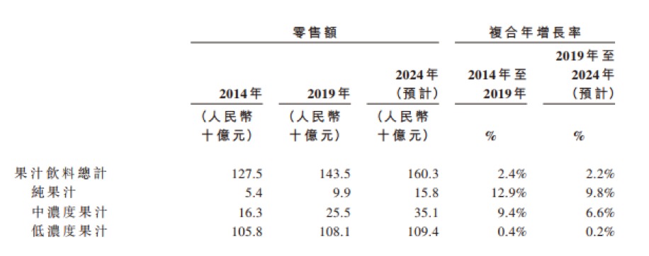 2019年我国果汁饮料行业规模为达1435亿,2014-2019年CAGR为2.4%,是软饮料市场第三大细分行业。果汁饮料有三种果汁浓度:纯果汁(果汁含量为100%)、中浓度果汁(果汁含量为30%至99%)和低浓度果汁(果汁含量为5%至29%)。其中,低浓度果汁的市场份额最大,2019年低浓度果汁零售额占整体果汁饮料零售额的75.3%。根据弗若斯特沙利文报告,受到消费者可支配收入提高和健康意识增强的驱动,从2014年至2019年,纯果汁及中浓度果汁零售额的复合年增长率分别为12.9%和9.4%,远超过同期低浓度果汁0.4%的增速。预计纯果汁及中浓度果汁的增速将进一步提高。按零售额计算,从2019至2024年,预计纯果汁及中浓度果汁市场规模的复合年增长率将分别达到9.8%和6.6%。