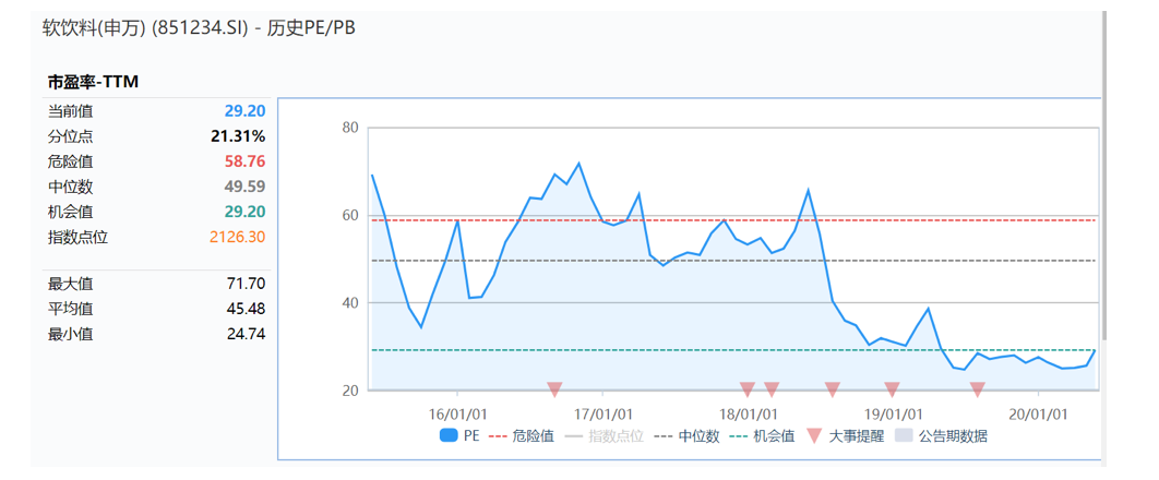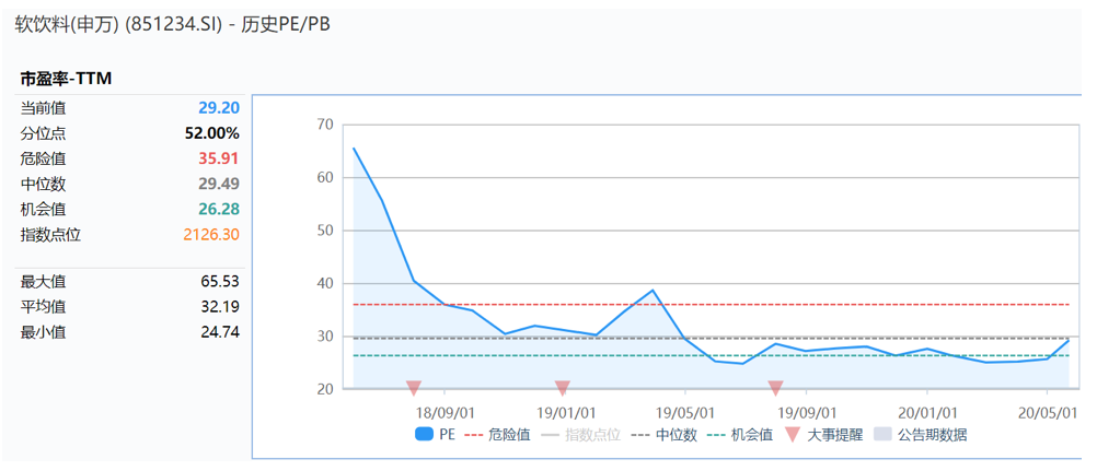 选取软饮料(申万)指数851234作为参考,近五年行业的平均PE(TTM)为45.48倍,波动区间为[24.74,71.70],近两年行业的平均PE(TTM)为32.19倍,波动区间为[24.74,65.53]。故从指数角度,A股市场的软饮料估值波动区间在32.19X-45.58X。