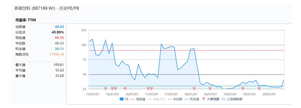 选取wind香港饮料指数887169作为参考,近五年行业的平均PE(TTM)为55.62倍,波动区间为[25.00,109.81],近两年行业的平均PE(TTM)为31.40倍,波动区间为[25.00,40.65]。故从指数角度,港股市场的软饮料估值波动区间在31.40X-55.62倍。