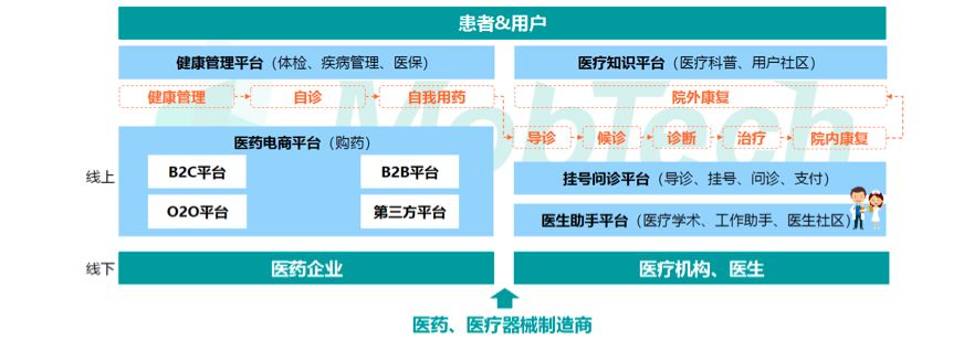 互联网医疗健康行业包括在线咨询、健康管理、医药电商、在线广告及营销推广、保险合作以及病人导引。参考Mob研究院,医疗健康流程涉及患者、药企、医疗机构、医生4个主体,互联网医疗行业可分为5类平台,包括健康管理平台(体检、疾病管理、医保)、医疗知识平台(医疗科普、用户社区)、医药电商平台、挂号问诊平台、医生助手平台。