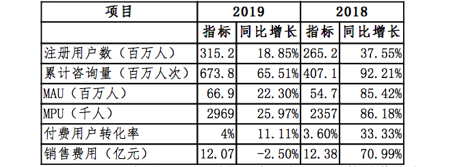 截止2019年底,公司毛利率23.13%(约60%的成本来自自营模式下健康商城板块的货物采购,约30%的成本来自消费性医疗业务支付给线下服务提供商的费用,约10%的成本为自有医疗团队薪金),但销售费率高达23.81%,仍在烧钱获取流量的阶段。虽然从绝对量上看,销售费用得到了控制,但可以明显看到公司单一用户的获取成本大幅提高,2019年的注册用户增速也从2018年的37.6%降到18.9%,活跃用户增幅由2018年的85.4%下降至22.3%,付费用户增幅由2018年的86.2%降至26%。