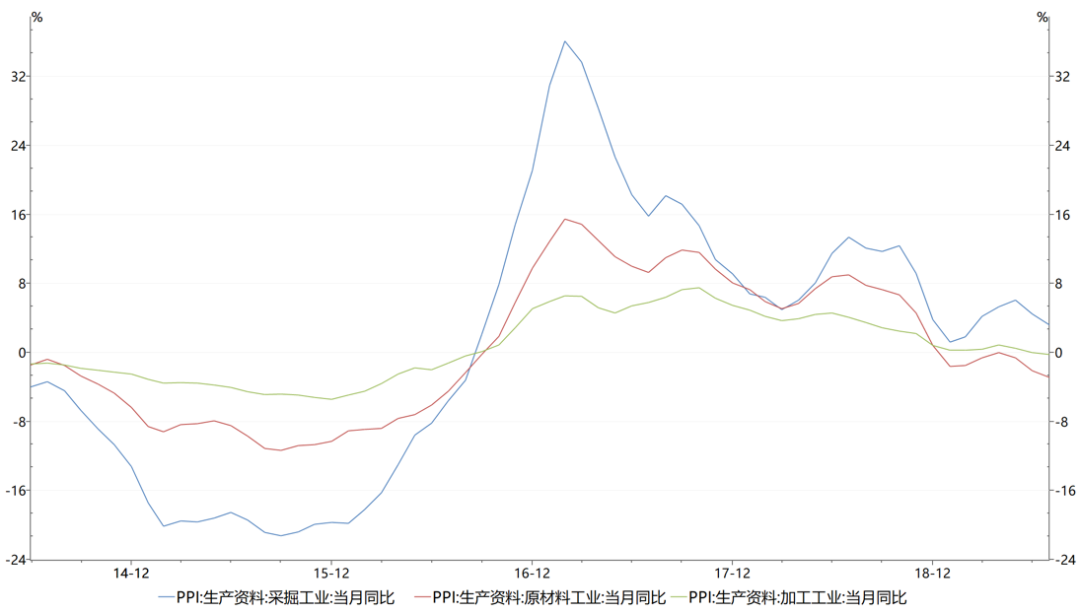 2019年7月生产资料价格继续大幅恶化,生活资料PPI同比回落0.1%。2012-2015年产能过剩,需求较弱的局面再次出现。
