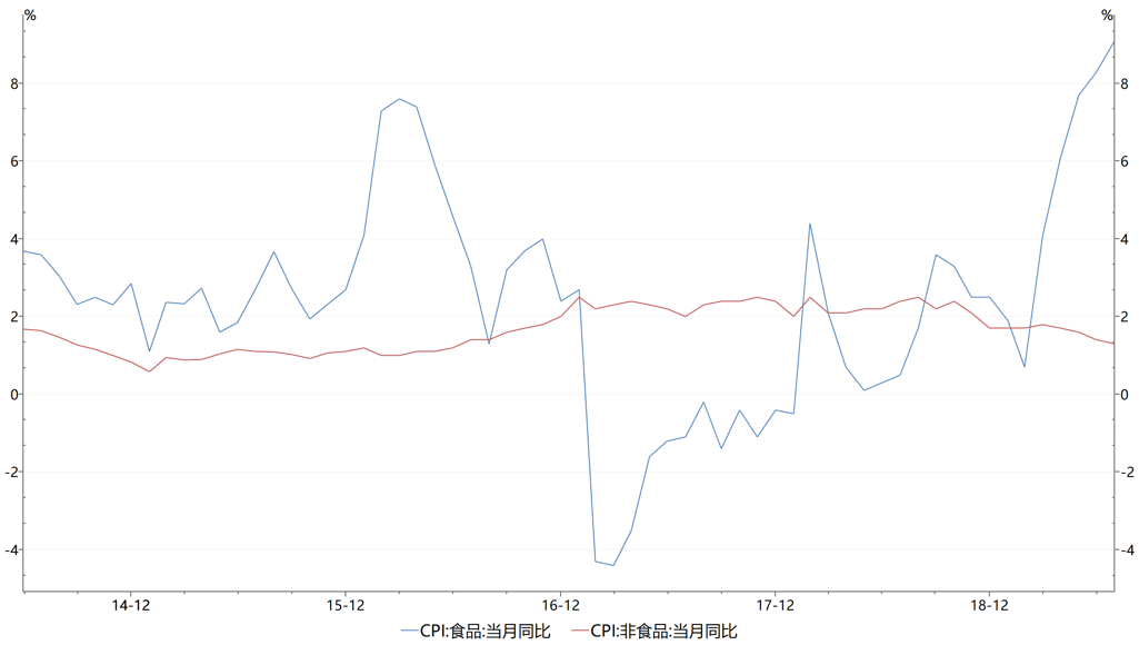 食品价格上涨对冲交通和通信行业价格下降,其他CPI权重较去年同期均有不同程度的下滑,CPI能维持目前水平的唯一推动因素为食品价格。
