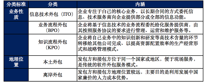 软件外包有多种分类方式,按照业务性质,软件外包可以分为与IT职能直接相关的信息技术外包(ITO)和与IT职能非直接相关的业务流程外包(BPO)和知识流程外包(KPO);按接包方相对于发包方的位置,软件外包可分为本土外包和离岸外包。具体分类如下: