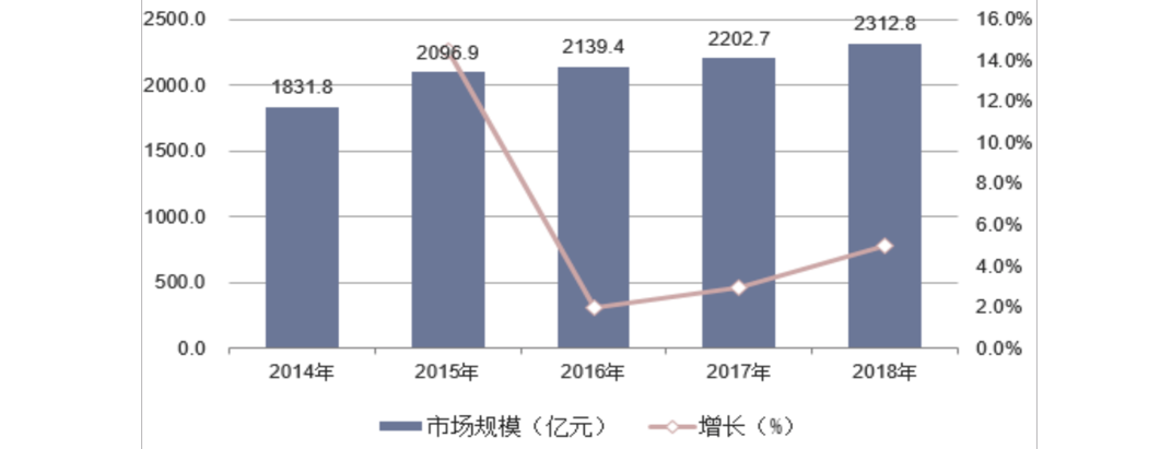 随着《中国制造2025》、“互联网+”、建设“数字中国”、建设国家信息化发展能力、“数字经济”被写入政府工作报告,可以看到,中国政府正大力助推数字经济在国内的发展。同时,我国正积极推进服务业发展来助推产业结构转型升级。研究表明,服务业开放通过承接国际产业转移等效应推动了我国软件行业向全球价值链两端攀升。我国软件外包市场也迅速发展,行业市场规模迅速扩大,以人民币计,2014年国内软件外包市场规模约1831.8亿元,到2018年达到了2312.8亿元(如下图所示)。以行业内7%的年复合增长率预估未来3-5年内我国软件外包市场规模将达到3000亿元,成为软件行业的中坚力量。