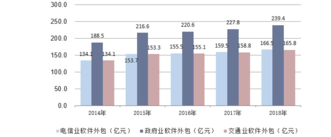 2018年中国电信业软件外包市场规模为166.5亿元,同比增长4.4%;政府业软件外包市场规模为239.4亿元,同比增长5.1%;交通业软件外包市场规模为165.8亿元,同比增长4.4%。