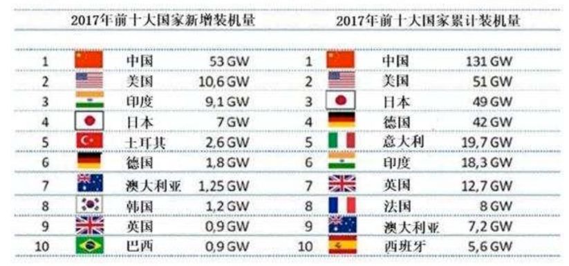2017年全球新增装机容量102GW,同比增长33.7%。其中,中国2017年装机53GW,全球装机占比过半,系第一大市场,预计2018年装机为55-60GW,持续领跑全球。同时,印度有望超越美国成为全球第二大市场。根据SolarPower Europe近日发布的新数据,2018年新增太阳能发电容量为104.1GW,相比之前的预测的102.7GW多了1.4GW。