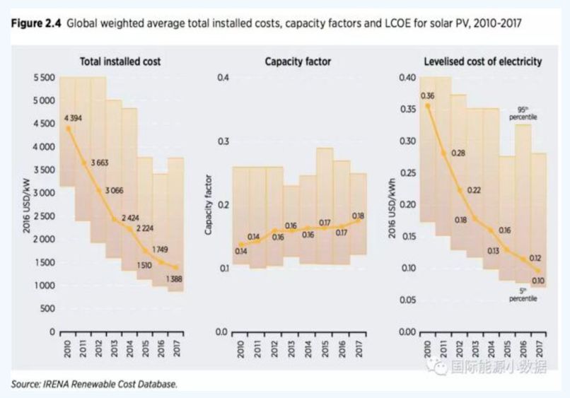 全球平均而言,2010年大型地面光伏发电平准成本LCOE为0.36美元/千瓦时,2017年LCOE为0.10美元/千瓦时,7年间下降了72%。2010年的大型地面光伏装机投资成本为4394美元/千瓦,2017年为1388美元/千瓦,7年间下降68%。2010年光伏发电站的容量系数平均为0.14,到2017年提高为0.18,7年间上升28%。据展宇周总介绍,终端电站建造成本为5000元/千瓦。