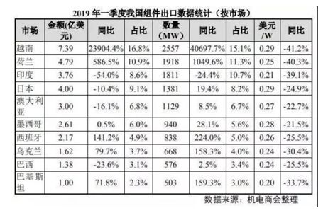 从出口市场看,我国组件出口前五位市场分别是越南、荷兰、印度、日本和澳大利亚。中国光伏产品出口美国大门已经关闭,2019年一季度组件出口量只有0.01GW。