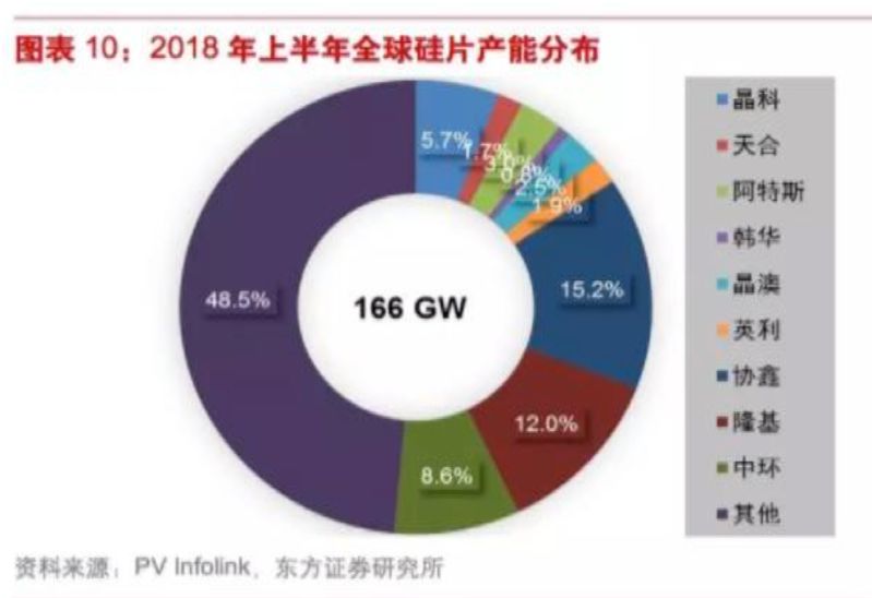 根据PVInfolink的统计数据,截至2018年上半年,六大一体化组件厂(晶科、晶澳、天合等)和三大硅片厂的产能份额已达全球产能的50%以上,产量份额则超过55%。其中,协鑫、隆基、中环三大硅片厂2018年上半年的产能和产量份额分别达到36%和40%,头部效应非常突出。
