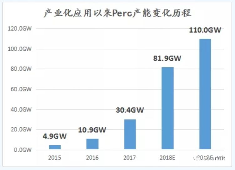 2018年,单晶perc组件产能将达到30GW;用黑硅技术处理后的多晶perc组件产能将达到5GW。