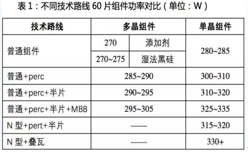 传统普通多晶组件功率为270W,普通单晶组件功率为285W,功率差为15W;当各自叠加一系列新技术以后,功率差会进一步拉大。2018年各种技术路线的组件功率分布