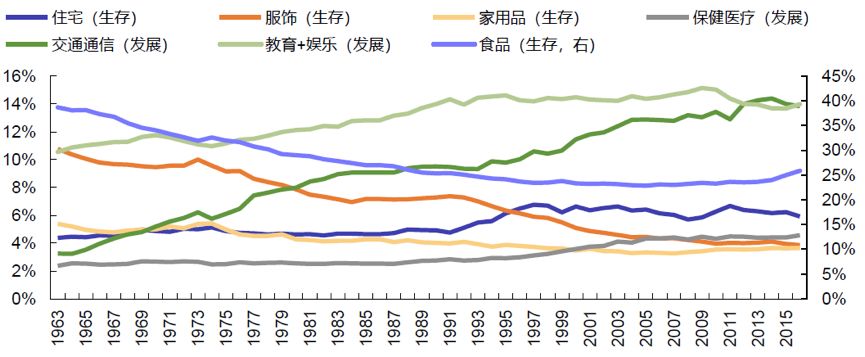 1.可选性消费:现代化生活节奏加快、必要消费项目占比减少,如衣食住行的基础性支出:谷物、传统服饰、家居耐用品、公共交通、学费、医疗和药品等消费项。同时,家居消耗品、教育补习、保健服务、私人交通、通信、熟食和外食等方便食品等领域仍然处于成长中的最佳时期。