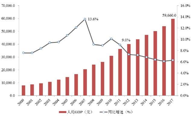 长期看,消费总水平的提高来自于收入总水平的提高中国的人均GDP绝对金额一直保持上升,但增速从2007年以来一直下降。近5年,国内居民的人均消费支出占人均GDP的30%-31%。