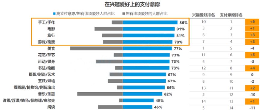 人们消费更关注自我价值,消费越来越倾向于取悦自己,越来越多的人愿意花费金钱和时间来精进自己的兴趣爱好,更注重情感性、分享性等消费,目前以在手工/手作、电影、旅行、动漫等兴趣领域的支付意愿最高。