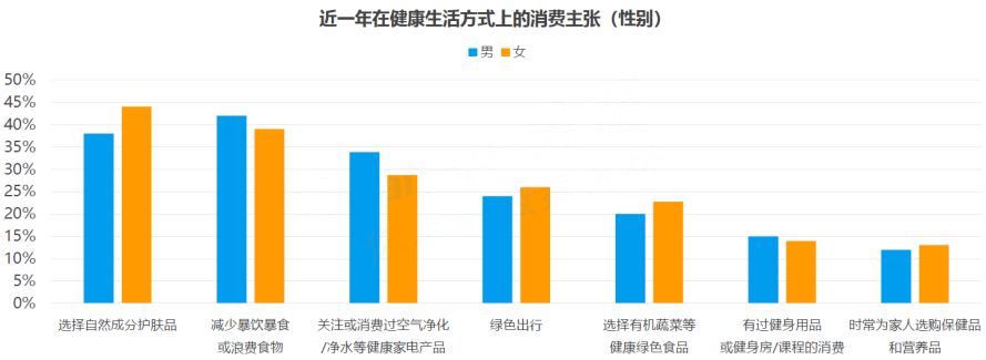 健康的生活方式备受重视及普及,越来越多的消费者愿意为健康的生活方式及饮食买单。其中男性和女性在健康环保上的消费主张不尽相同:男性倾向于健康家电产品和健身产品的消费;女性则更倡导绿色出行和对护肤和营养品的消费。