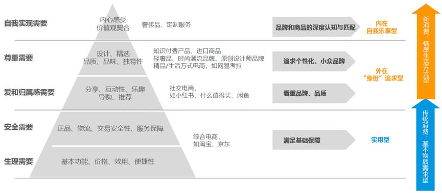 从马斯洛的需求层次考虑,消费者已从初期的只关注产品的基本功能性需求及交易安全便利性,到现在更多的关注产品品质、设计、分享、互动,跨越到了对产品个性化、高品质的需求,由基本物质需求型进入情感生活方式型。