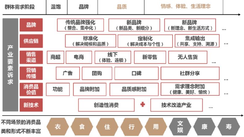 随着社会进程的前行以及主力消费群体的需求演变,围绕消费场景(衣、食、住、行、文、娱、康、寿)的品类和形式不断丰富,激发消费产业链各个环节的活力,带来机会。比如:如国内的消费品牌,格力(品牌及供应链)、淘宝(互联网新技术改造产业)、索菲亚(定制化)、三只松鼠(社群分享)等;日本的消费品牌,优衣库(以理性消费为理念的新品牌)、无印良品(去品牌化而重视品质感)等。