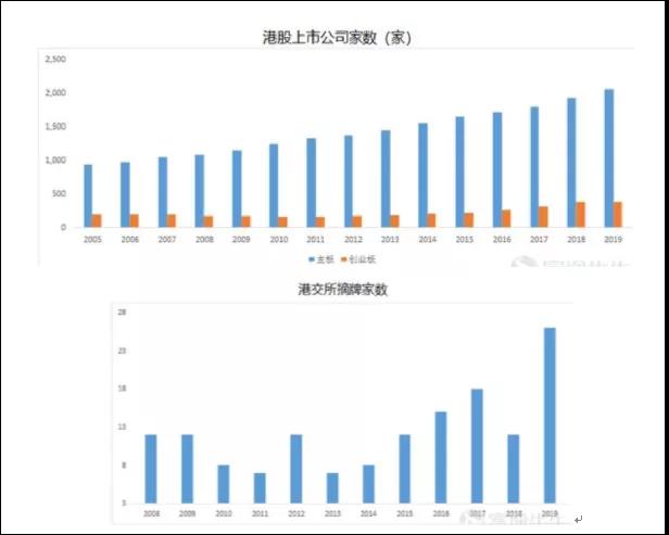 截至2019年末,港股共有2052家主板上市公司(IPO 168家,存续总数较2018年末增加126家),384家创业板上市公司(IPO 15家,存续总数较2018年末减少5家)。
