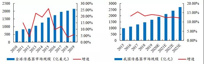 传感器是物联网的核心器件,是连接物体与数据的基础设备,可将自然信号转换为电信号,对信息进行处理和存储。根据中国信通院数据,中国传感器市场规模保持较快增长,2019年达到1678亿元,同比增长13.99%,近5年年化增长率为13.96%,保持两位数的增长率,贡献全球增速的大部分。预测未来五年年均复合增长率约为12.66%,2021年将突破2000亿元。