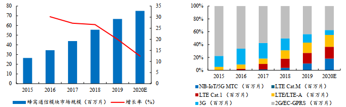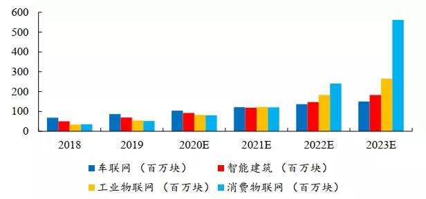 无线通信模块使各类终端设备具备联网信息传输能力,是连接物联网感知层和网络层的关键环节,属于底层硬件环节,具备其不可替代性。无线模组行业的下游分散,包括共享经济、农业环保、医疗健康、车联网等子领域,故厂商的核心竞争力来源于产品的覆盖广度。智研咨询预计2020年市场需求分别达1.04亿块、9220万块;未来三年消费物联网、工业物联网等需求量亦大幅提升。