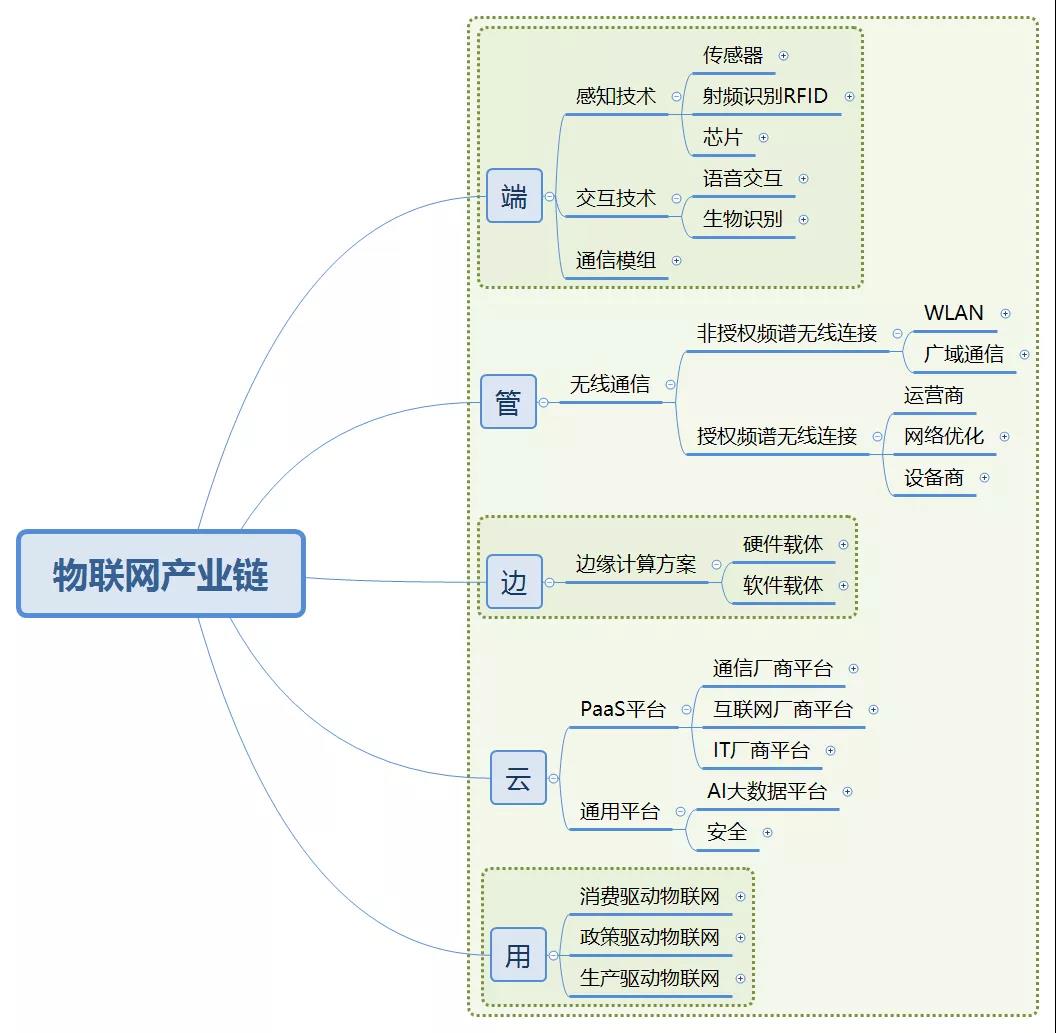通过上述产业链可以看到,物联网核心环节可以由数据的流动来进行关联后,其全产业链图谱十分清晰,具体如下: