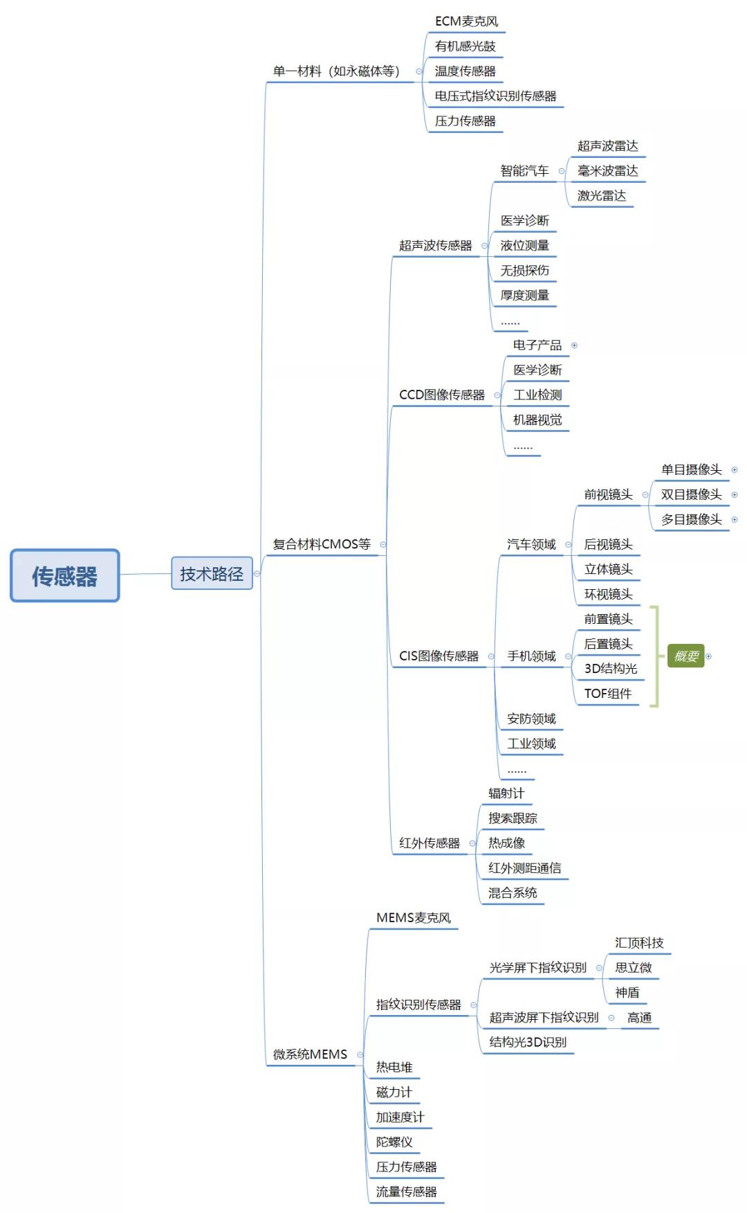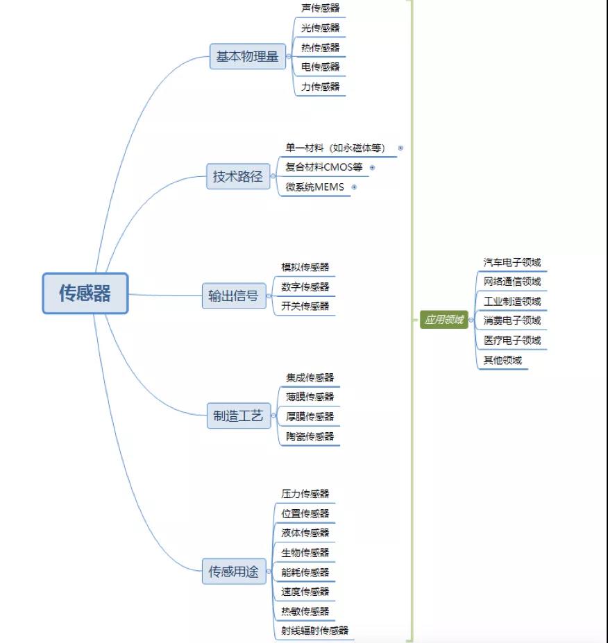 传感器技术历经了多年的发展,其品种繁多、分类方式多样,按照常规分类方式,可以从感应物理量、技术路径、应用场景等对进行系统分解。从感应物理量来分类,我们可以将传感器分为声,光,热,电,力等基本物理量传感器;从技术路径来分类,可以分为单一材料传感器(如压电传感器等)、组合材料传感器(如CIS传感器等)和微系统传感器(如MEMS等);从输出信号分类,可以分为模拟传感器、数字传感器、开关传感器等;同时根据制造工艺、传感用途等均可将传感器进行分类,其框架如下: