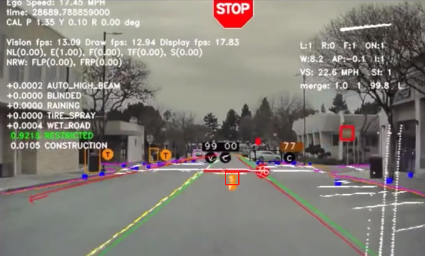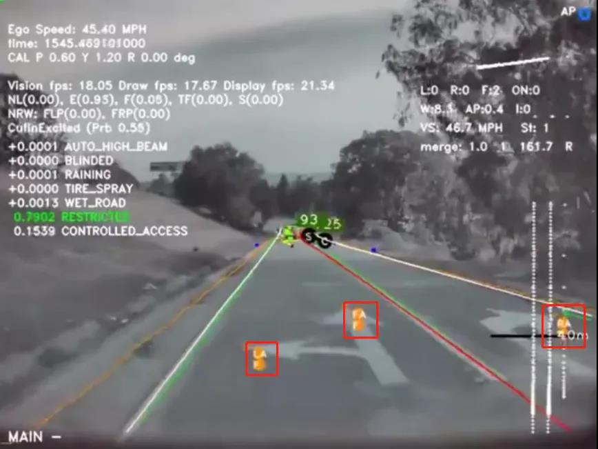 8个摄像头与其他雷达实现传感器融合,可以有效地定位和识别障碍物(雷达是非常好的互补传感器,可以直接估计速度)。